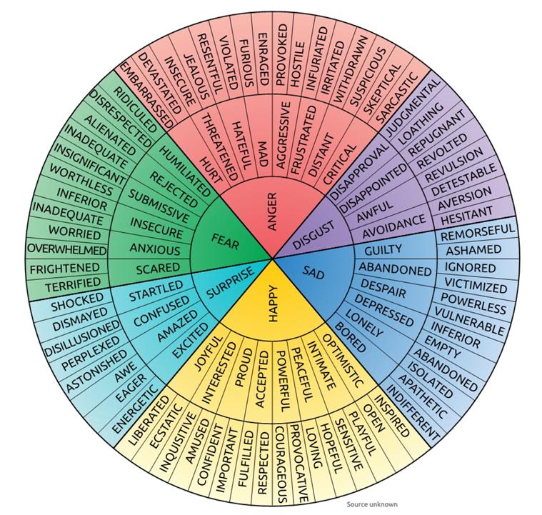 - Using the Wheel of Emotion- shows the primary emotions (like joy, sadness, anger) and breaks them down into more specific feelings (like betrayed, content, or powerless). They can help you pinpoint exactly what one is feeling at that moment.